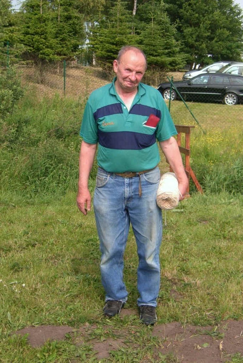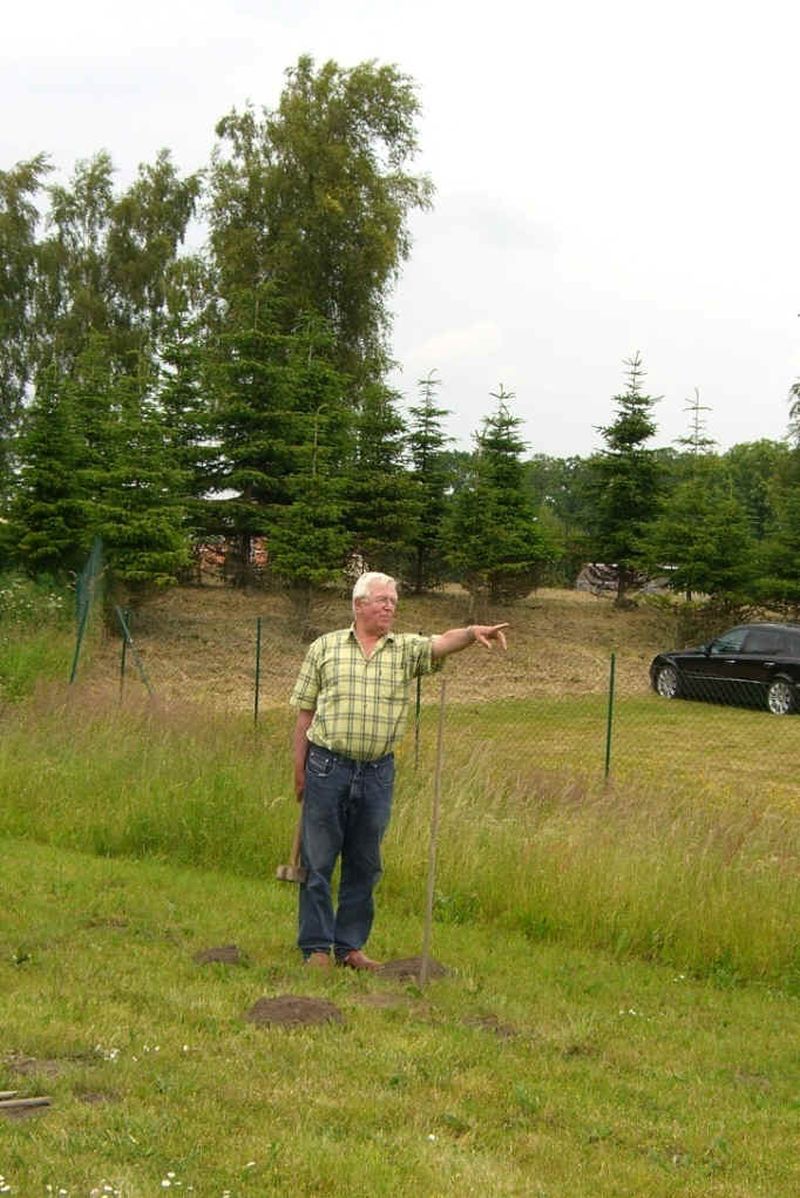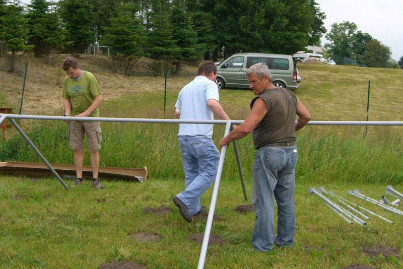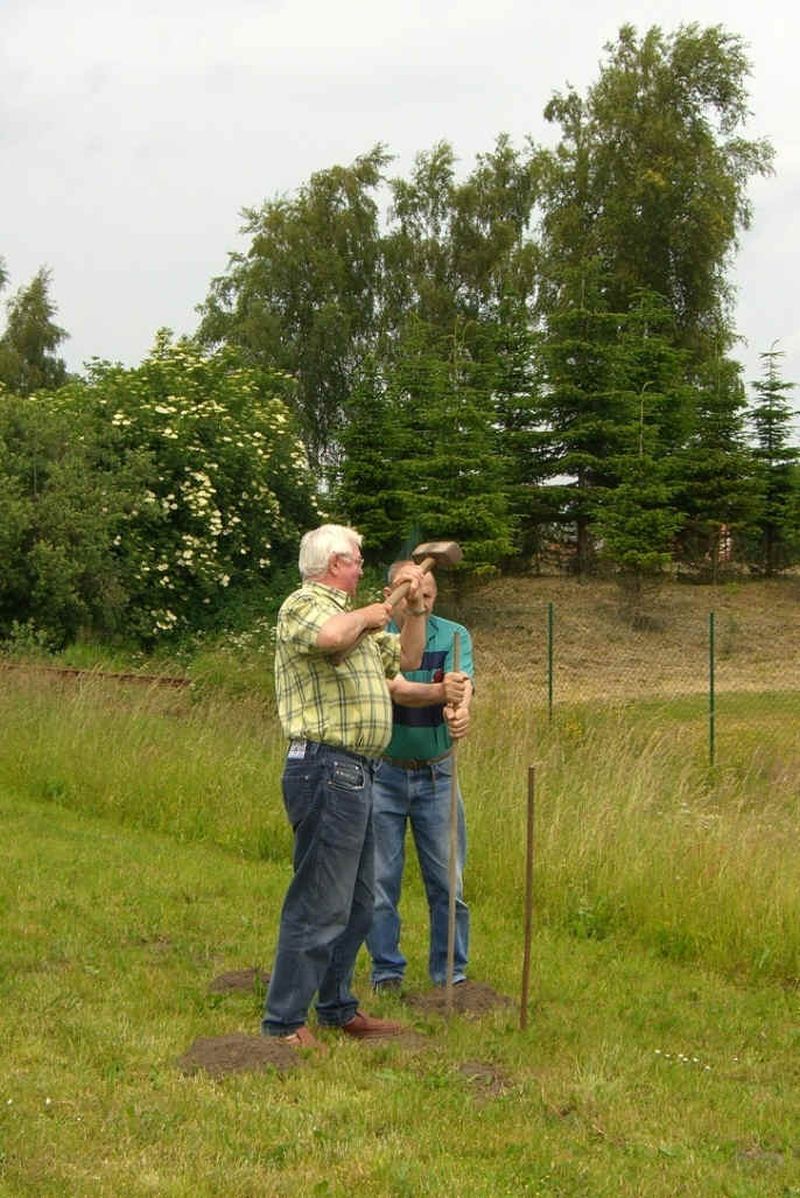 Der erste Pfahl sitzt und nun war es wichtig die anderen Pfähle so einzuschlagen, dass am Ende gleichmäßige und große Rechtecke heraus kommen. Hans zeigt schon mal in die richtige Richtung. Manfred kümmert sich um die elektrische Verkabelung und dass in jedem Ring sowie an allen Ständen ausreichend Anschlüsse zur Verfügung stehen.