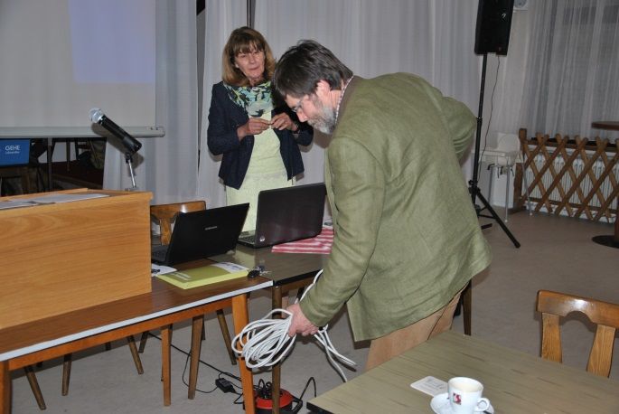 Das war insoweit interessant, weil wir so miterleben konnten, wie der gesamte Vorstand Hand anlegte, um die Veranstaltungstechnik vorzubereiten. Die Lautsprecheranlage war aufzubauen und auszurichten. Das Gleiche galt für den Beamer und die Leinwand. Auch diverse Laptops mussten angeschlossen werden. Also ganz schön viel zu tun.