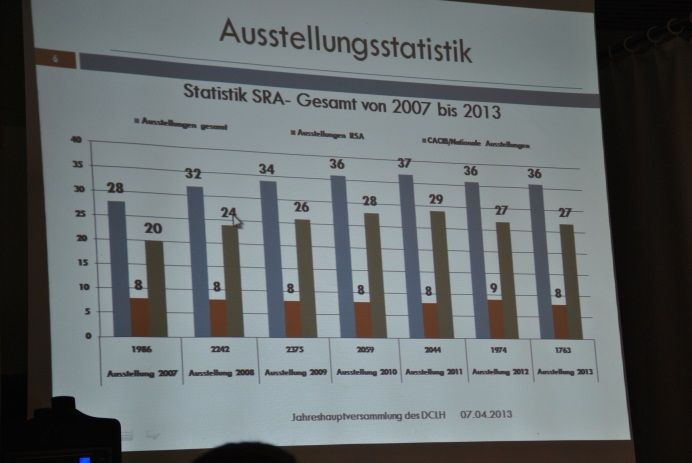 Wolfgang Meier stellte fest, dass das Jahr 2013 ein außergewöhnliches für die Hundezucht war. Nach umfangreichen Informationen zu den Trends bei den Wurfzahlen, den Welpen-Zahlen, Kaiserschnitten, Nabelbrüchen und vielem Anderen konnte er auch darüber informieren, dass zwei Erstzüchterseminare mit jeweils 15 bis 20 Teilnehmern durchgeführt wurden und fünf Körungen stattfanden.