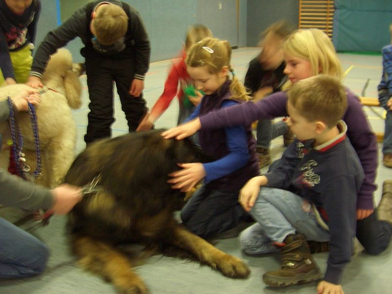 Den Abschluss bildete nun diese Stunde, in der die Kinder Fragen stellen konnten, die Hunde streicheln und ihnen Leckerlis geben und sich überwinden, ihnen näherzutreten.
