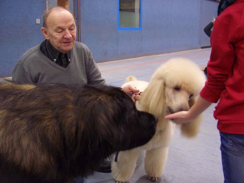 “Fiete von der Bärenpranke”, ein Leonberger und “Rasmus von der Herbordsburg”, ein Großpudel, zusammen mit ihrem Herrchen, Herrn Zentner.