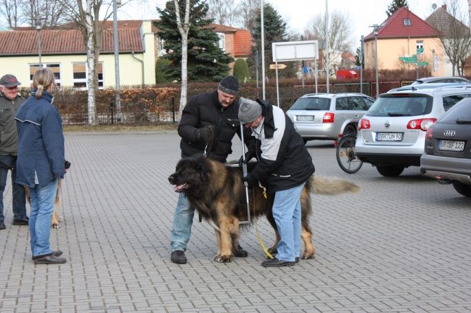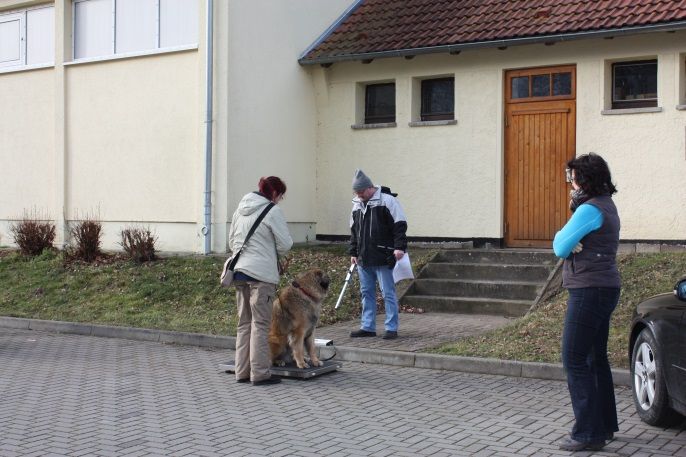 Erste Station war das „Wiegen und Messen" und da zeigte sich, dass hier und da noch ein gewisser Trainingsbedarf zu erkennen war. Die gestellte Situation war für einige unserer Leos neu. Aber mit viel Vertrauen zu Frauchen und Herrchen und zur Waage war das mit dem Wiegen doch relativ schnell und auch gut geschafft.