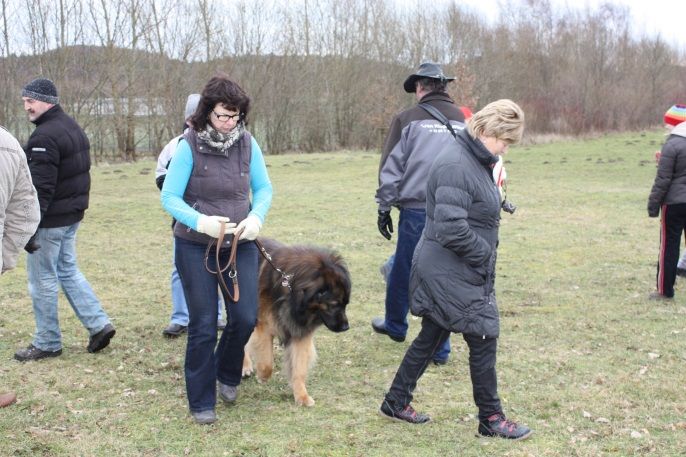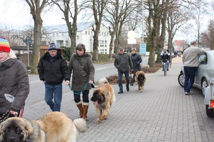 Wenn ich mich nicht verzählt habe, dann waren wir insgesamt 16 Leonbergerfreunde und mit ihnen 9 Leos, die sich in Tessin auf dem Parkplatz vor dem Freizeitzentrum eingefunden hatten. Natürlich waren nicht nur „Kör-Anwärter" zum Training erschienen, sondern auch einige Leonberger mit ihren Besitzern, die die erste bzw. auch die zweite Körung schon hinter sich haben und die die Rolle der „Statisten" beim Training übernahmen.