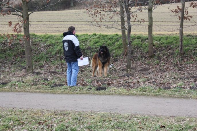 Unten sehen wir Norbert bei der Prüfung „Hund auf sich allein gestellt". Alle unsere teilnehmenden Leonberger waren dabei aufmerksam und nicht ängstlich. Wenn das zur Körung auch so klappt, dann braucht sich keiner Sorgen machen. Auch der Vorbeimarsch von zwei Rüden bringt Wasa hier nicht aus der Ruhe.