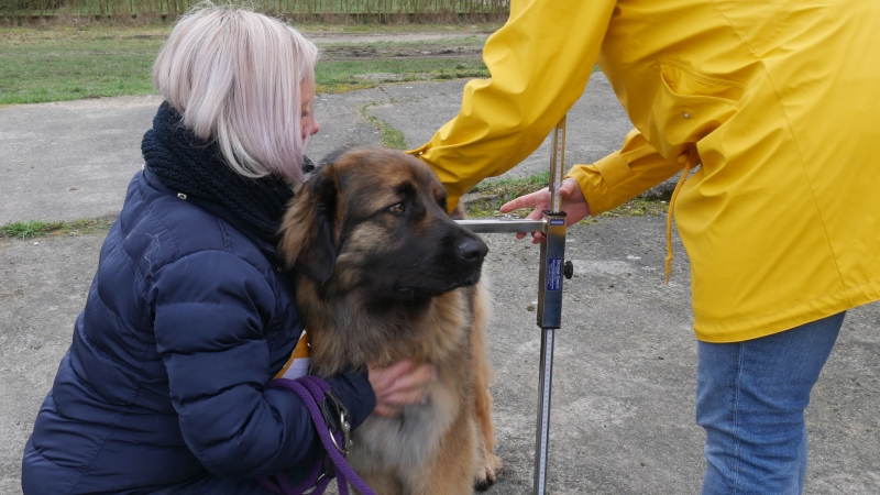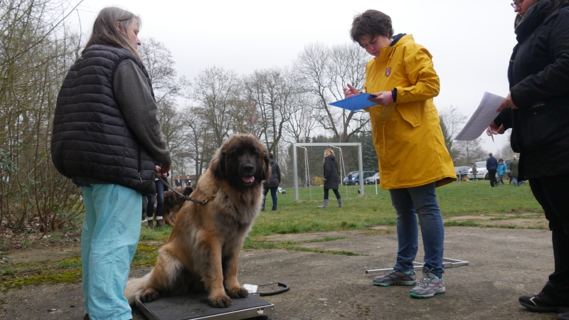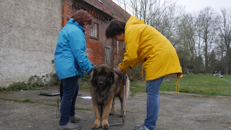Der erste Prüfungsteil für die Leonberger war das Wiegen und Messen, um im Anschluss das Verhalten zwischen Hundeführer und Hund in weiteren Stationen zu beurteilen.