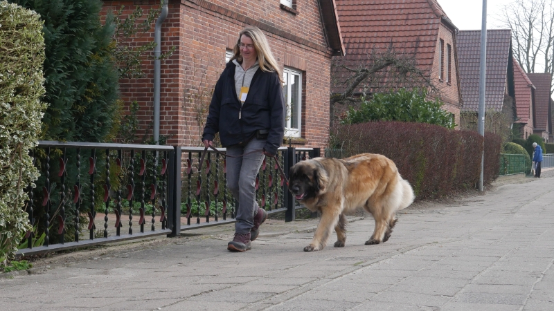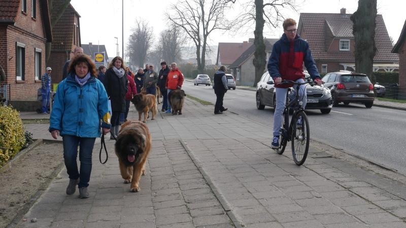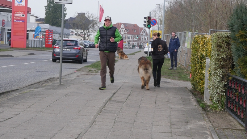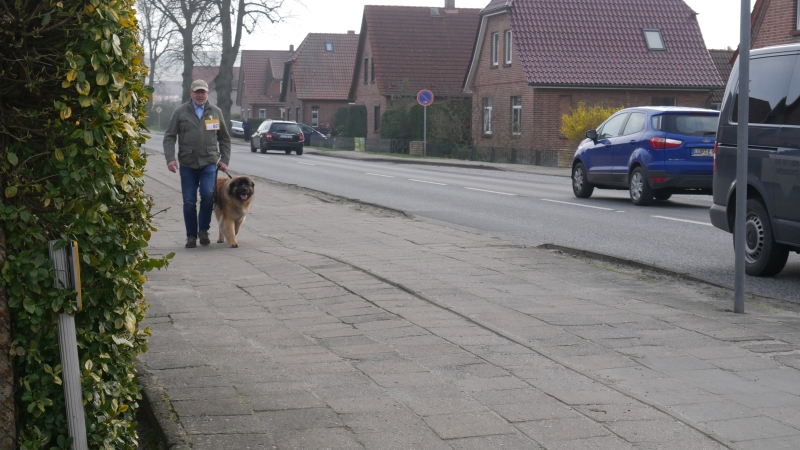 Ein weiterer Teil der Prüfung bestand darin, wie sich Hund und Hundeführer im Straßenverkehr verhalten. Dazu ging es nach Wittenburg. Ein Jogger und ein Radfahrer kreuzten unverhofft den Weg von Hund und Hundeführer. Hier war Gelassenheit ein wichtiges Kriterium.