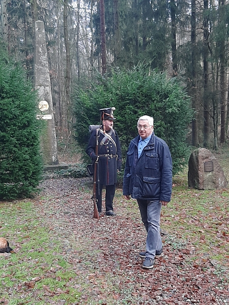 Die Fellnasen beschnupperten links und rechts die Strecke. So ein Waldweg birgt doch jede Menge Düfte. Nach ca. 30 Minuten erreichten wir, versteckt mitten im Wald, die Gedenkstätte für Theodor Körner und aller Opfer der Befreiungskriege von 1806 – 1815. Hier erwarteten uns bereits Feldwebel Heinz von den Lützower Jägern und sein Vereinskollege Harald Albrecht. Beide Herren sind Mitglieder der Interessengemeinschaft „Lützower Freikorps 1813“, die dieses Denkmal und die Anlage pflegt.
