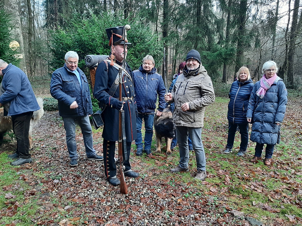Hatten unsere Vierbeiner unterwegs bereits viele Neuigkeiten erschnüffelt, gab es nun für die Zweibeiner viel Interessantes zu erfahren. Herr Harald Albrecht (nicht verwandt mit unseren Landesgruppenmitgliedern) verstand es, uns in der Zeit ca. 200 Jahre zurück zu versetzen. Fundiert und interessant erzählte er uns von „Theo’s“ kurzem Leben, dass dort ganz in der Nähe schon nach ca. 21 Jahren sein Ende fand. Wir hörten davon, wie es den Dichter und Freiheitskämpfer Theodor Körner zu dem Lützower Freikorps verschlug und er bei diesem, seinen Tatendrang zu stillen suchte. Einige Gedichte entstanden während dieser Zeit, wie z.B. „Lützows wilde Jagd“.