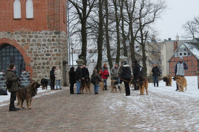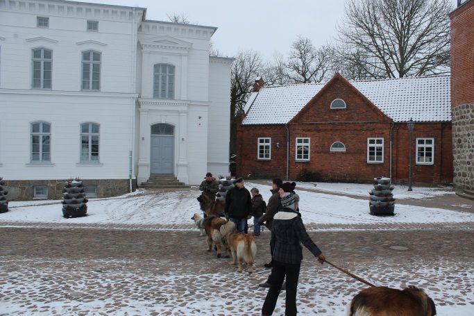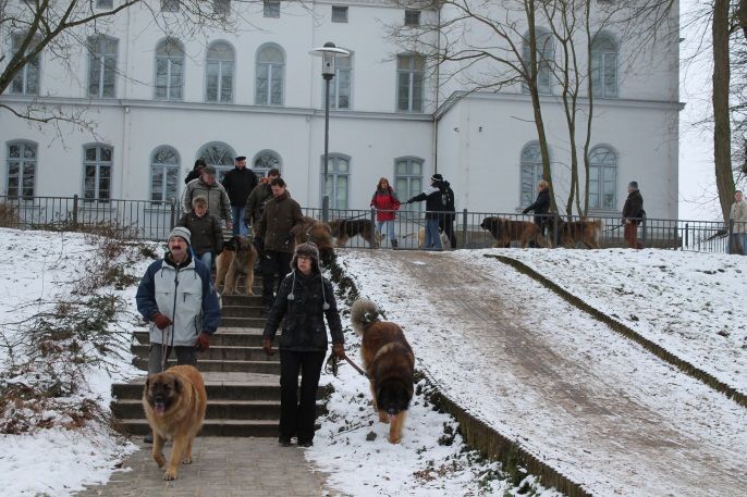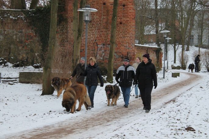 Zum Schluss der Wanderung gab es noch ein tolles Motiv für unsere Fotografen. Dieses Bild mit „Wasa vom Karniberg" und dem Glücksfänger zu Wittenburg sollte noch eine wichtige Rolle als Werbung für unsere Leonberger Hunde spielen, denn unser Besuch in der Stadt hatte Aufmerksamkeit und Aufsehen erregt.